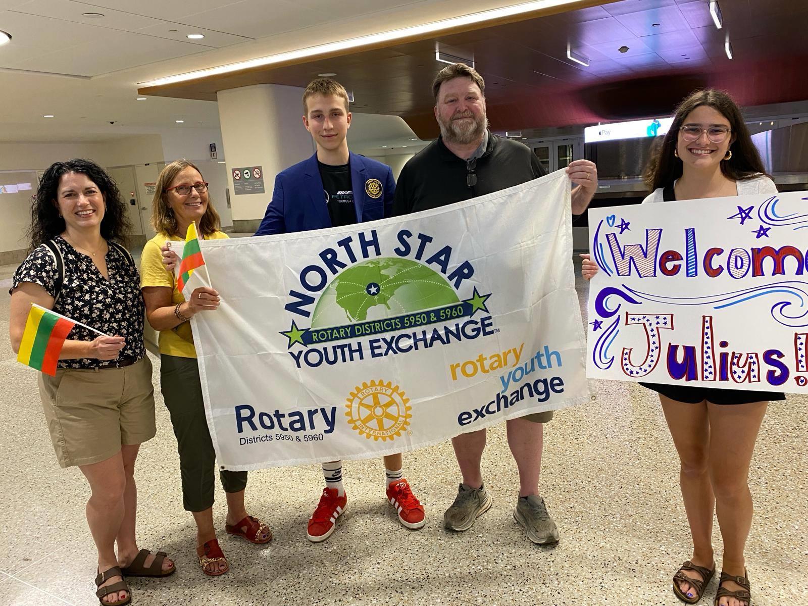 The Prior Lake Rotary Club and North Star Rotary Youth Exchange, the organization that coordinates the exchanges, provide much support for host families and the student. If you are interested or would like more information, please contact our Youth Exchange Officer Bill Schult at billmaxpo@gmail.com, or (651) 303-4194. Host families make all the difference. Together, we can ensure more students experience the life-changing power of Rotary Youth Exchange. Photo: Julius (center) from Lithuania was met at the airport by host mom Leah Cook, Club Counselor Cindy Shepard, Youth Exchange Officer Bill Schult, and host sister Sydney.